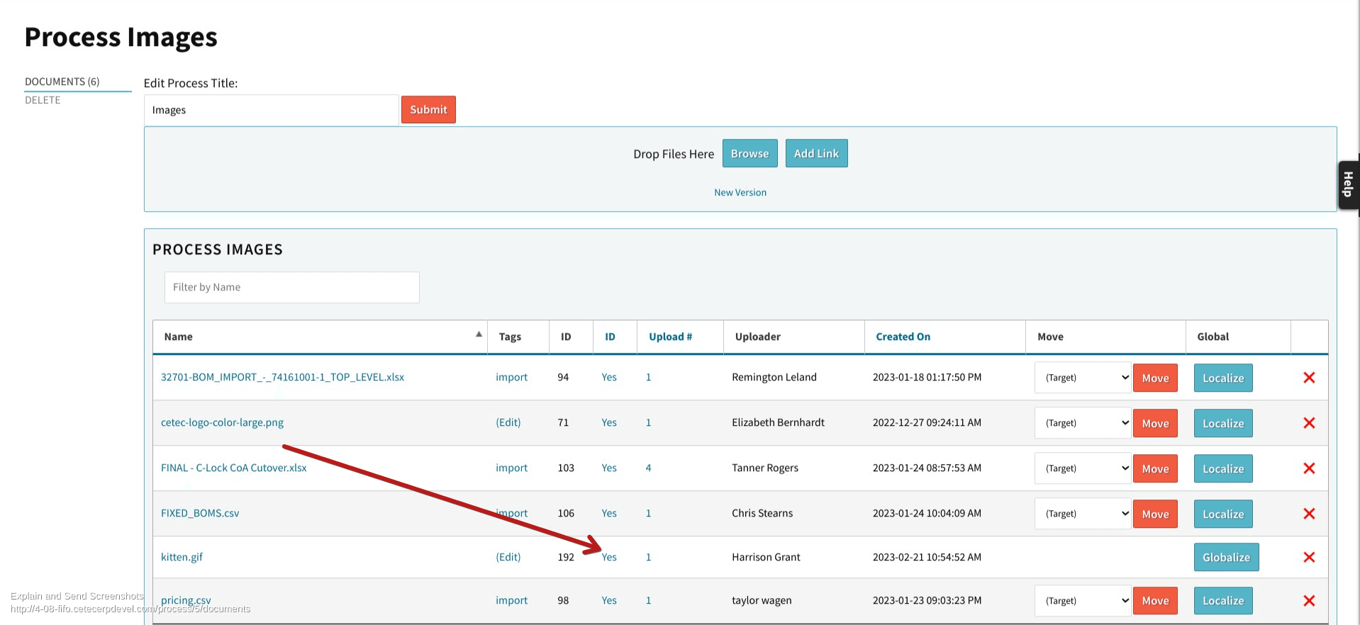 Once the process object exists, upload your images and videos into it. After each upload, click the "yes" link in the "ID" column to open the record and adjust its privacy settings.