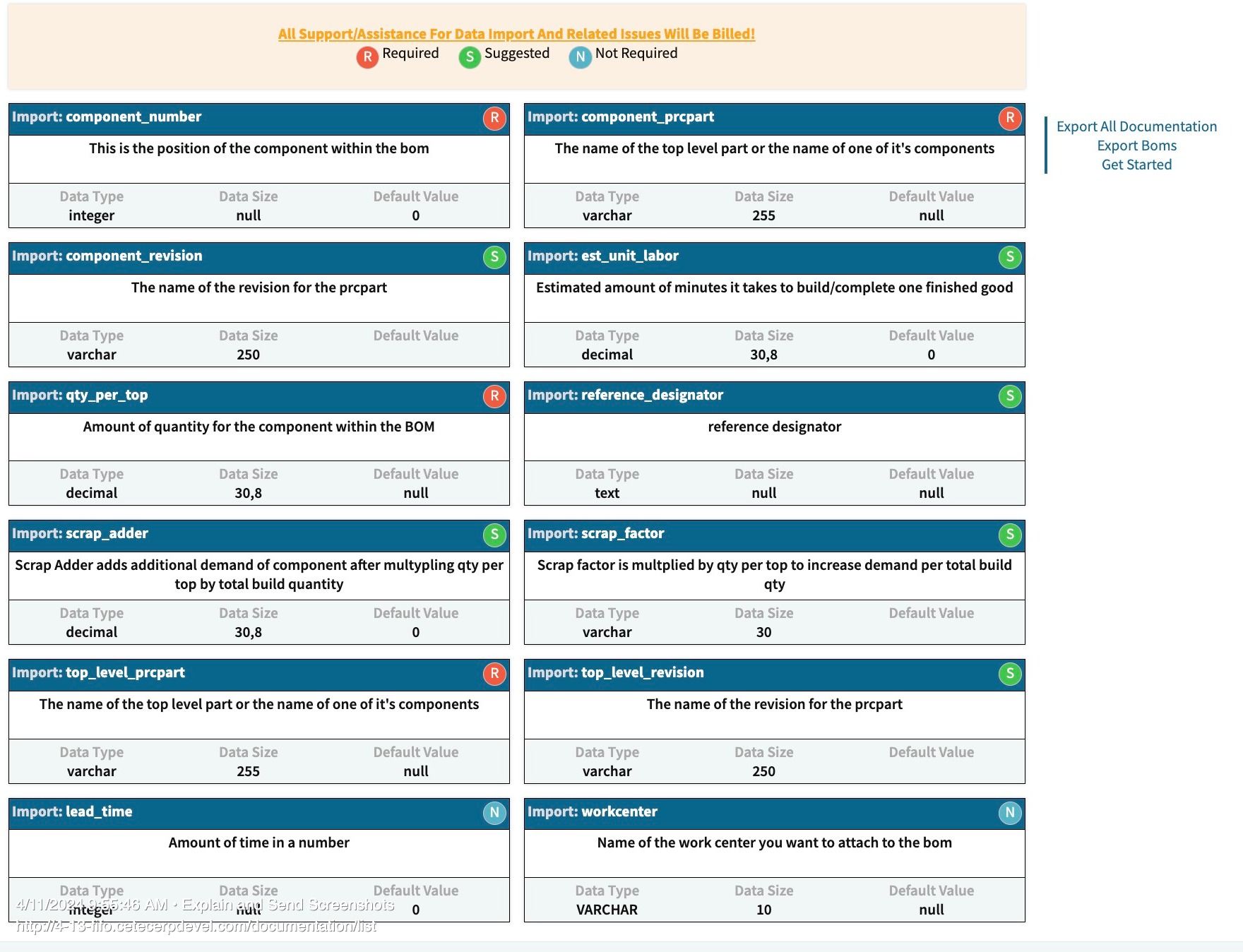 I have selected our BOMs import as an example. Now we can see what is required to import BOMs, what is suggested, and what is optional. To import a BOM, we have 4 requirements: component_number, component_prcpart, qty_per_top, and top_level_prcpart. From the right-hand menu, you can export a template that will have an example, and a blank page containing only the column headers to fill out.