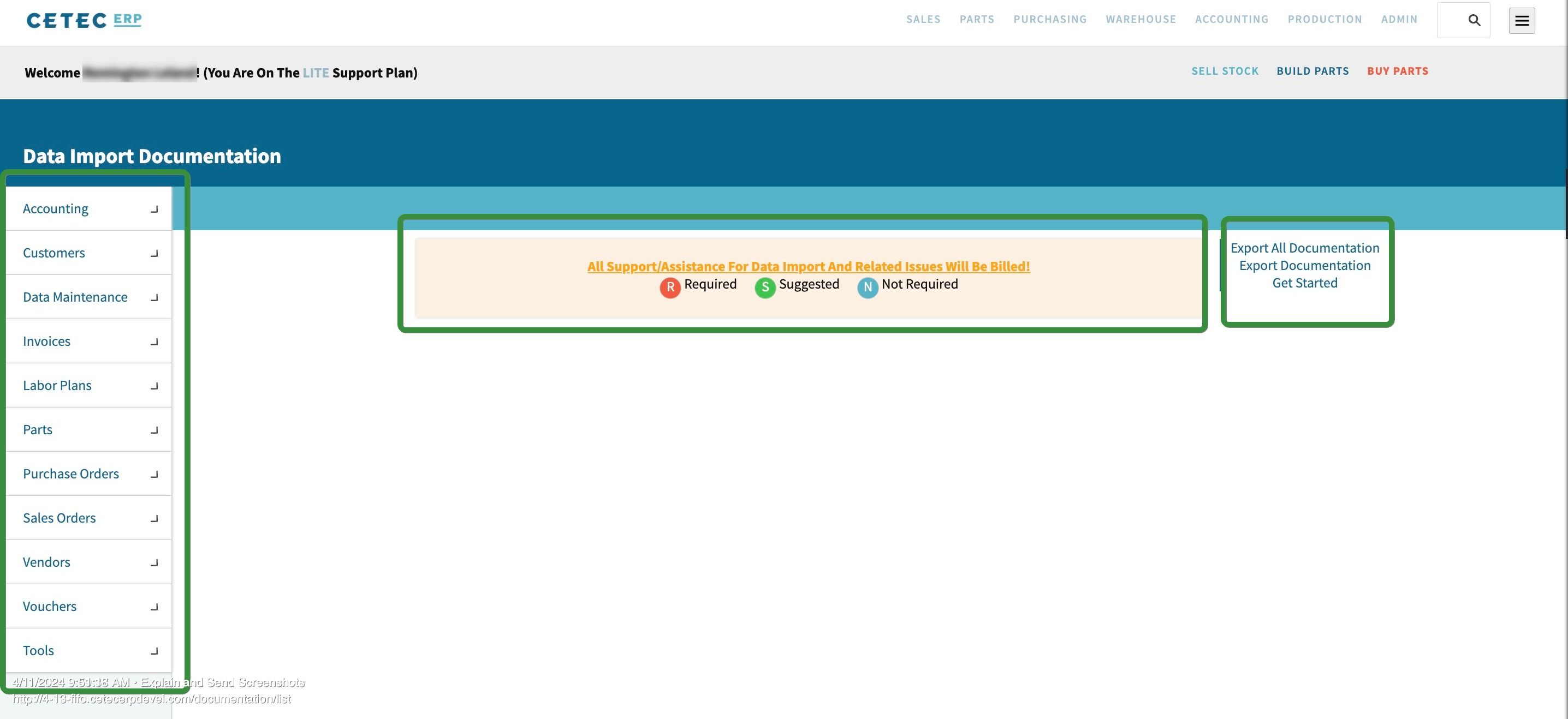 On the left-hand side of the screen, you will see the different category options for imports. In the middle top of the screen, you have a key showing the symbols for information that is required, suggested, and not required. To the right of the screen are the export options. Under the export options, you will also notice a hyperlink named ‘Get Started’. Pushing this button will take you to this page:
