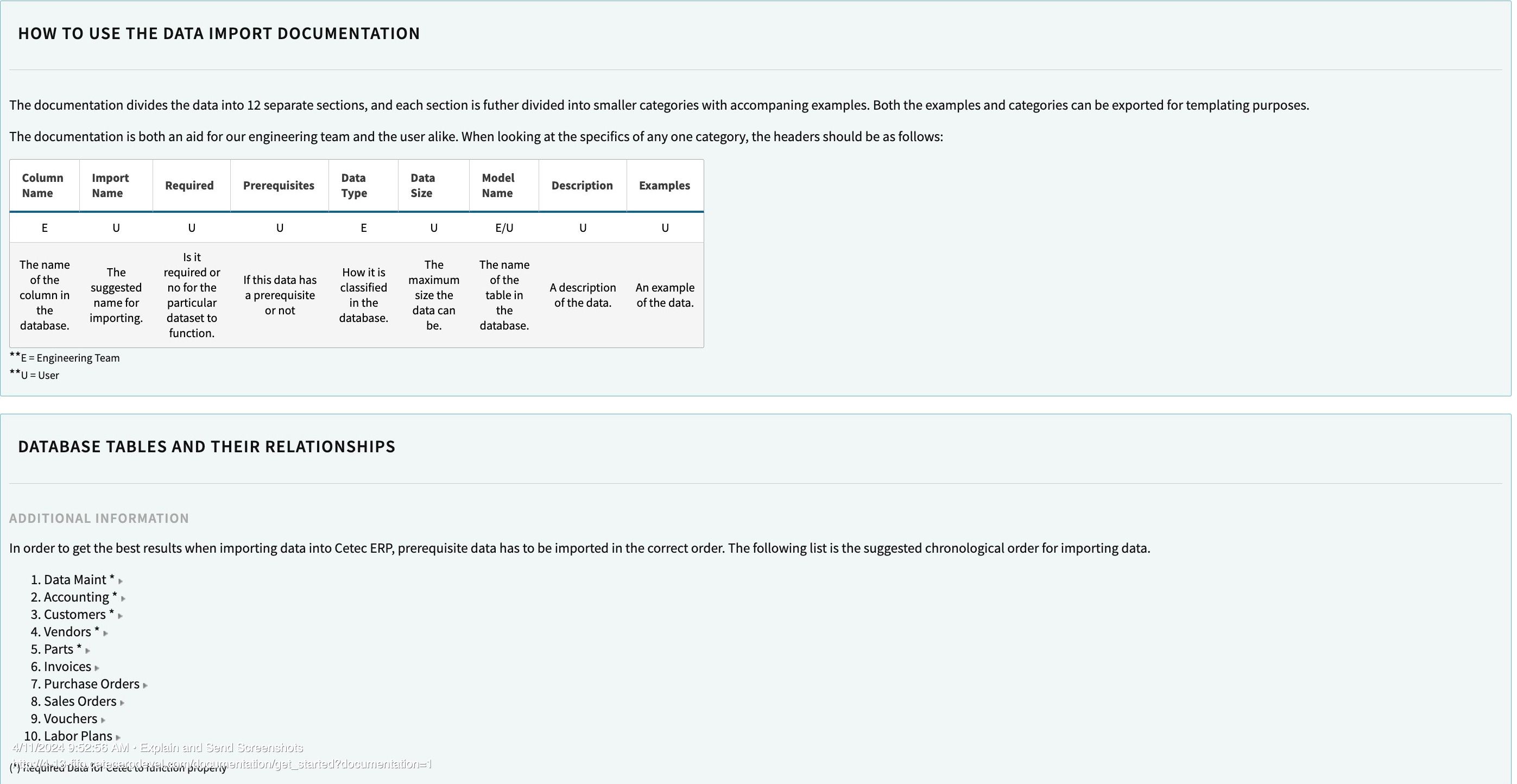 This page gives you a breakdown of how to use data import documentation. It also features a handy list of database tables and their relationships. This list also follows the suggested chronological order for importing data!