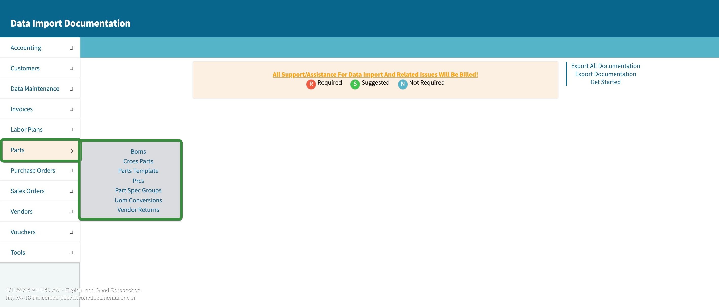 Let's go back to our Data Import Documentation page. We will choose the “Parts” category to use as an example. Here you can see the seven different import options for all parts related: