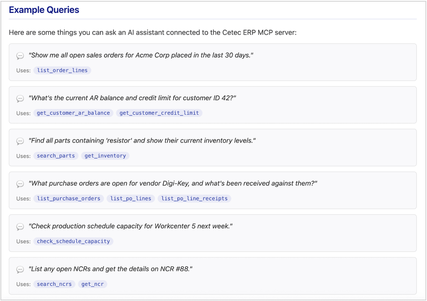 MCP lets AI assistants connect to your ERP data so that you can ask questions and return reports and information like "What are my top 10 open orders this month?" or "Show me inventory levels for part XYZ". Get live answers directly from your ERP data and summarized by your AI tool!