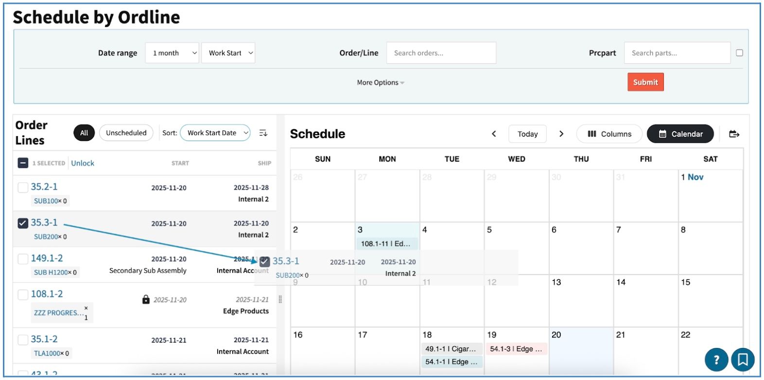 Schedule By Ordline (Order Line) is a new tool to help make getting work orders on the schedule easier. Using the Schedule By Ordline tool, you can search/filter to restrict results to a group of order lines you care about scheduling, view the orders next to a calendar, and drag the orders into the calendar view to schedule them.