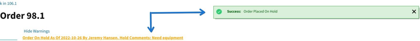 After the hold is applied, Cetec ERP displays a notification and a warning on the order indicating that it is on hold.