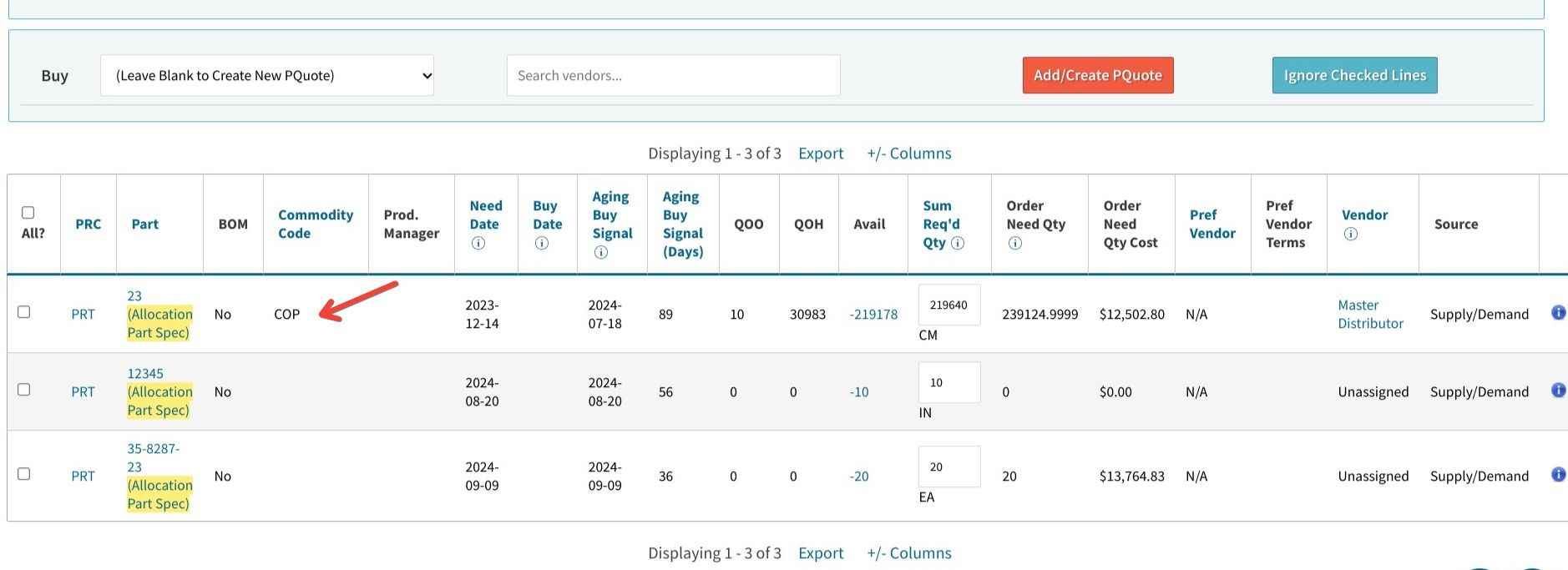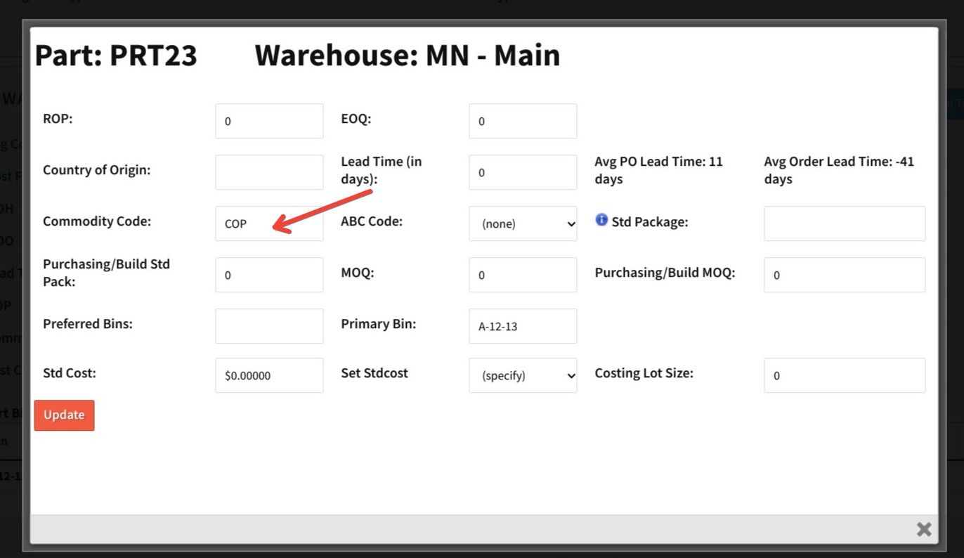 Clicking on the pencil icon will open an interface where you can input or adjust the commodity code for that part. Enter the desired code into the appropriate field. For instance, if you want “Copper” as a commodity code, you could utilize “Cop” as your code. This step ensures that each part is accurately categorized, aiding in more efficient inventory and purchasing processes.