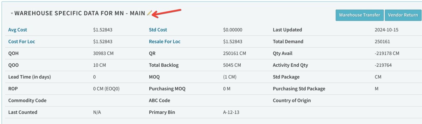 To begin, navigate to the part record section of your Cetec ERP. You’ll want to locate the part record you wish to edit. Once there, scroll down to find the warehouse part record section. Look for the pencil icon, which indicates the option to edit this record.