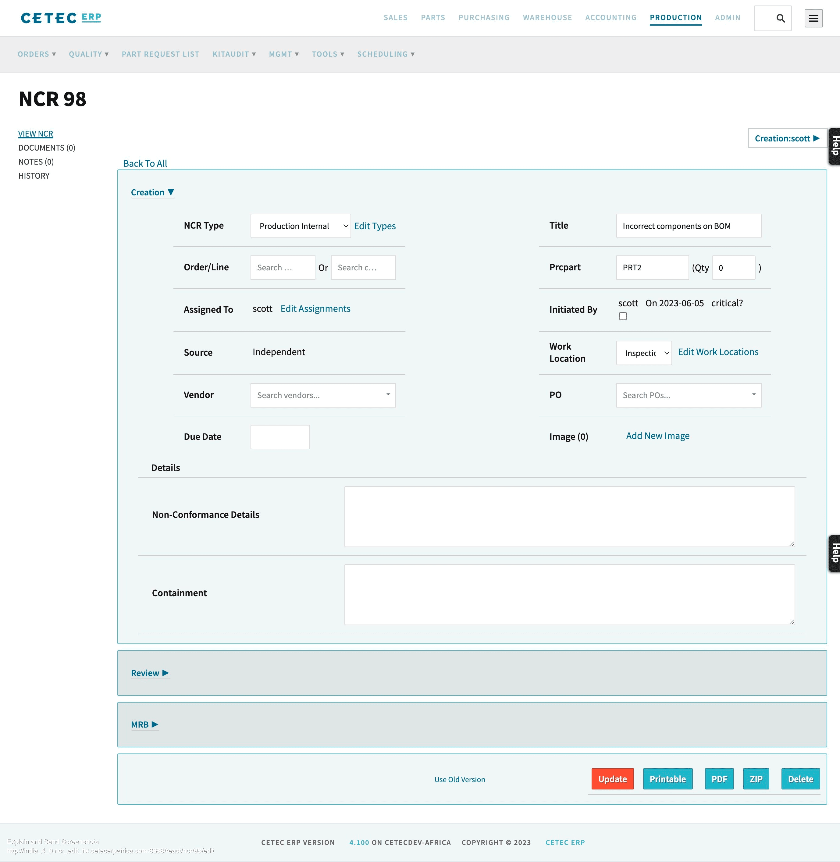 The page has been broken out into three collapsible sections for added convenience and ease of readability. The sections are “Creation”, “Review”, and “MRB”. These will change based on the progression of workflow stage changes. As a user moves the NCR from Creation to Review, the section of the screen will change, allowing the user to focus on that specific area. This will increase legibility and save time spent creating and managing an NCR.