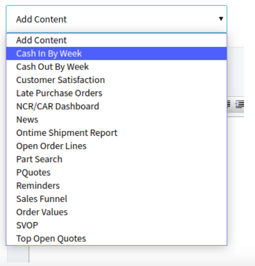 To add the Weekly Cash-In and Weekly Cash-Out widgets, start from the Executive Dashboard in Cetec ERP. You can reach it by clicking the Cetec ERP logo in the top left of the screen or by going to Admin, then Dashboard, then Executive Dashboard. At the bottom of the dashboard, below your existing widgets, you will see an Add Content dropdown where you can select and add both cash widgets.