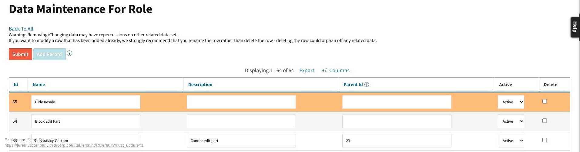 Click Add Row. Set the name to either “Hide Resale” or “Hide Cost”, then click Submit. These role names are pre-configured in the Security by Role settings, so the restriction takes effect when the role exists and is assigned to a user.