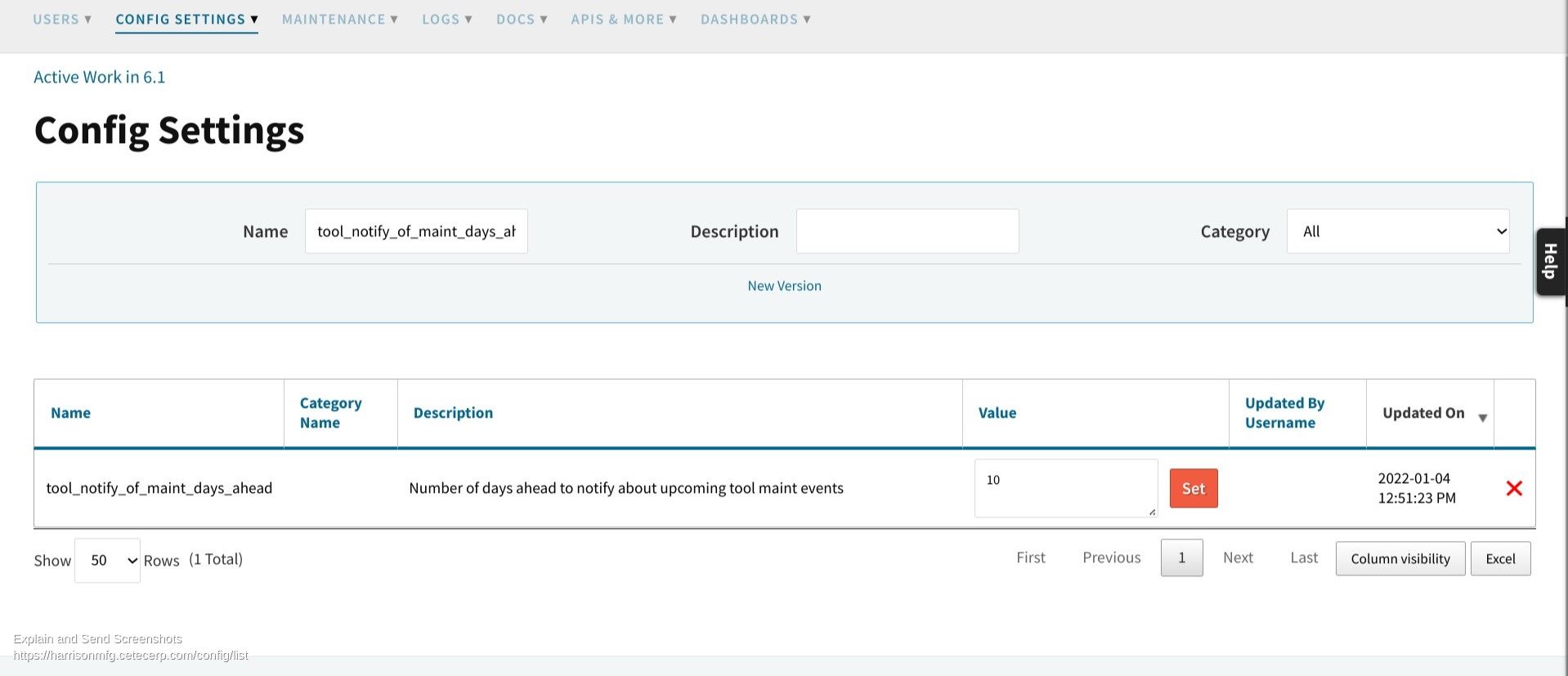 To control how early the reminder goes out, use the config setting “tool_notify_of_maint_days_ahead”. Set it to the number of days ahead of the maintenance due date that Cetec ERP should notify the assigned maintenance user.