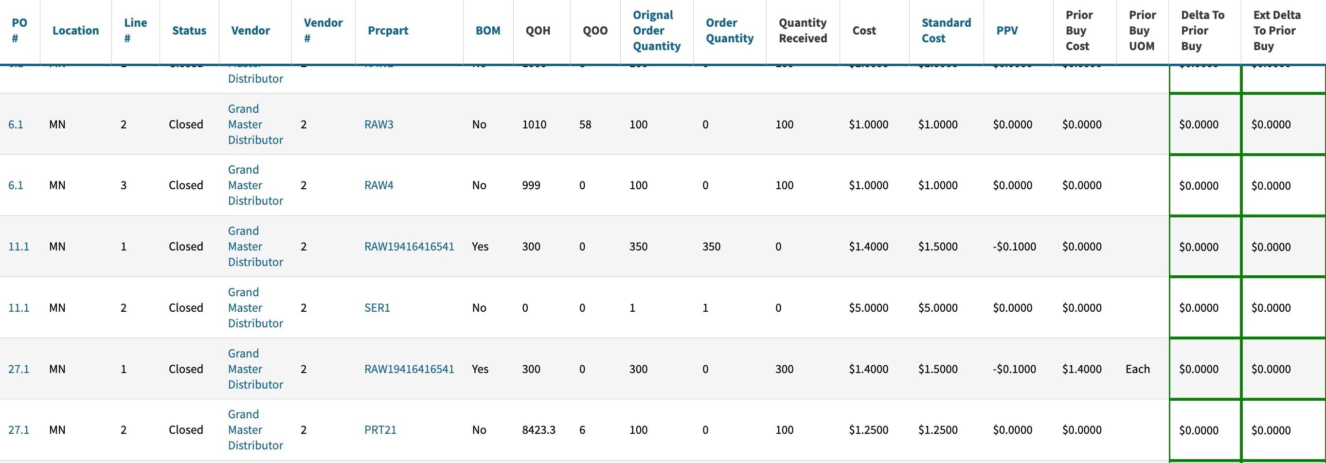 Your purchasing team can also view the Standard Cost for the parts that they purchase by using the PO Cost History report, and compare the Standard Cost column on the report to the PPV column on the report to compare pricing at the time of purchase. The Sales and Purchasing department can then coordinate with the users who manage inventory to ‘set’ those standard costs on the part record by editing the warehouse specific data using the pencil icon.