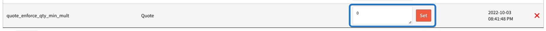 Set the value to 0 to allow quantities other than the standard package quantity. Set the value to 1 to disallow quantities other than the standard package quantity (enforcing exact multiples). Click Set to save the change.