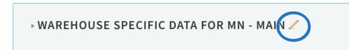 Start on the part record. Scroll to the warehouse section for the relevant warehouse and click the pencil icon to edit that warehouse’s fields.