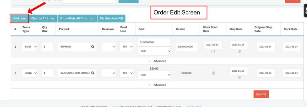 First, navigate to the order edit screen and add a new line for the same top-level assembly that is already on the order. On this new line, select the updated revision of the BOM part that you need to produce.