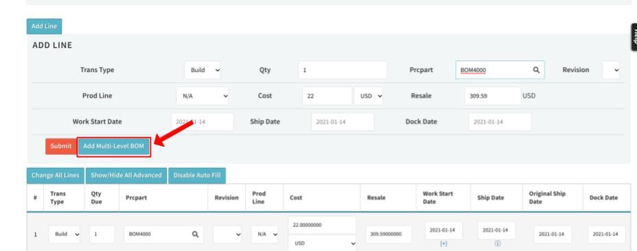 Set the transaction code on this new line to Build so Cetec ERP knows to create manufacturing demand from this order line. When you save the line with the updated revision and Build transcode, the Add Multi-level BOM button becomes available for that line.