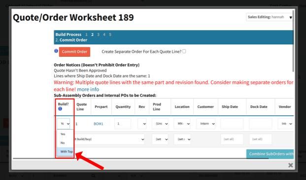 When you place an order for a multi-level BOM in Cetec ERP, the Commit to Order screen asks how to handle subassemblies. You can choose to build them on separate production orders, pull them directly from stock, or include them With Top. With Top means the components for that subassembly are rolled into the pick list for the top-level assembly and processed together, so no separate suborder is created.